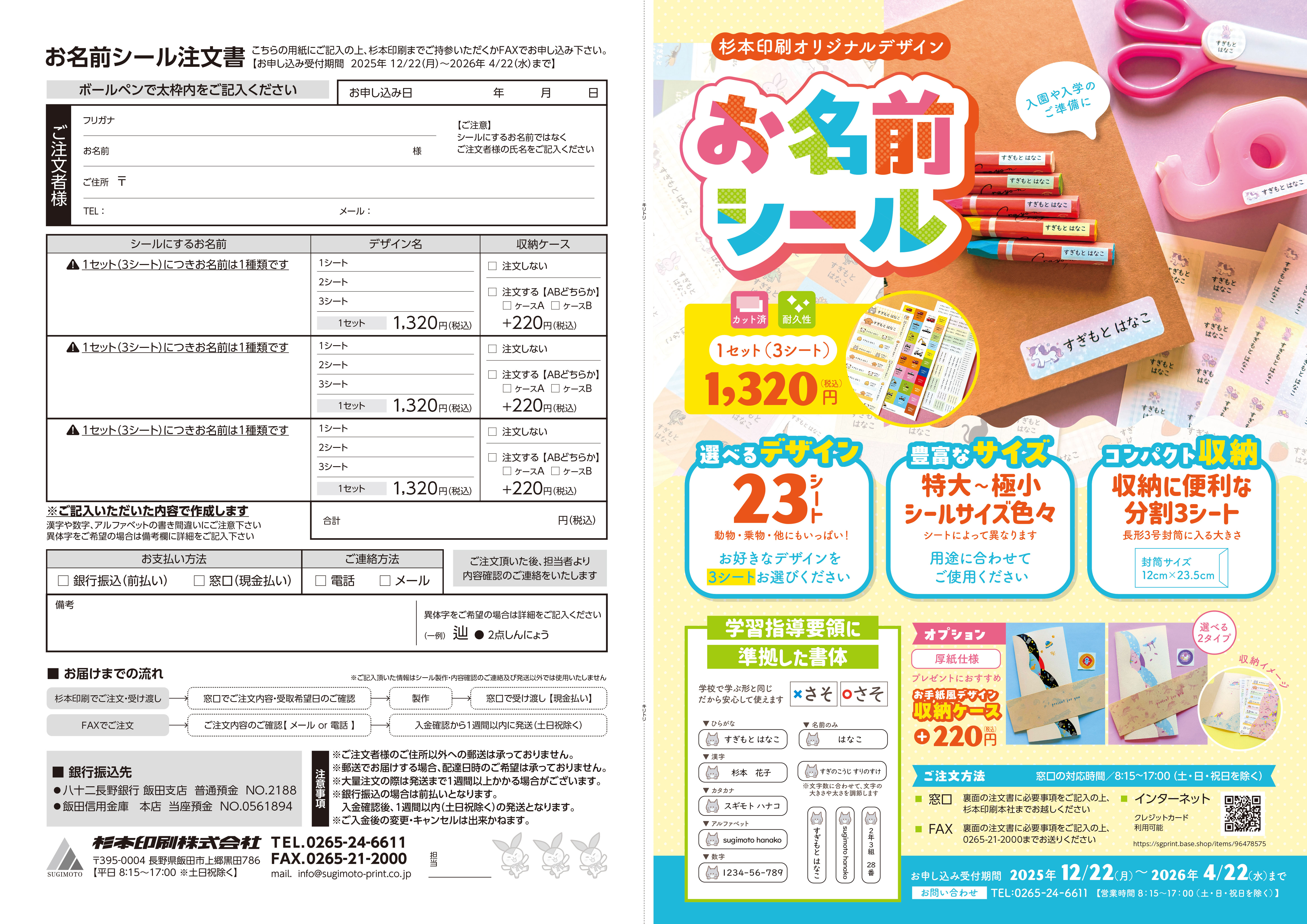 【杉本印刷オリジナルデザイン お名前シール 2026年ver】